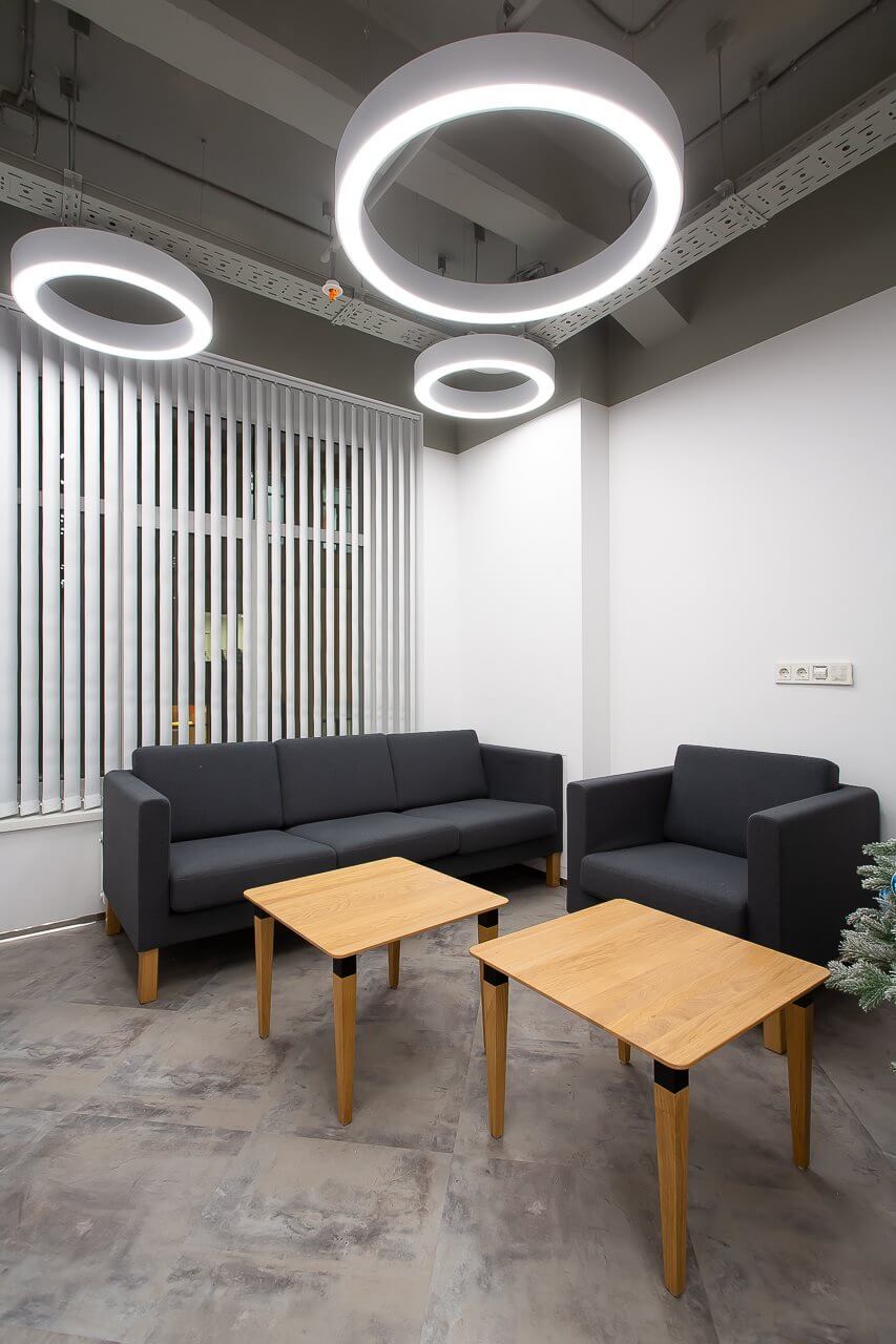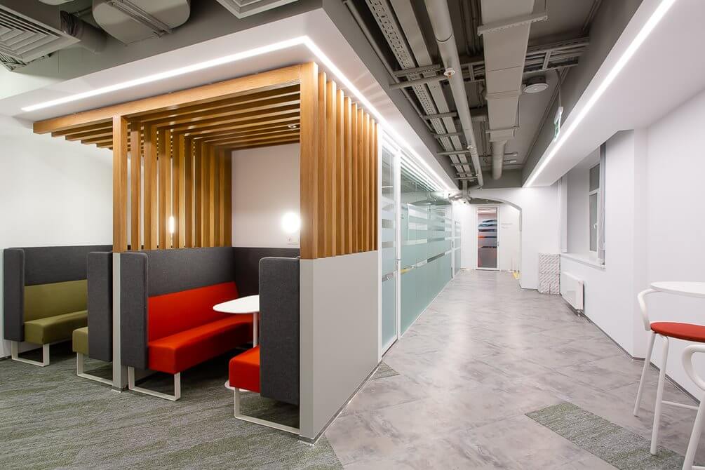 В лаунж зонах дизайнеры также создали комфортную и располагающую к общению атмосферу. Мебель простых форм гармонично вписывается в интерьер офисного пространства.