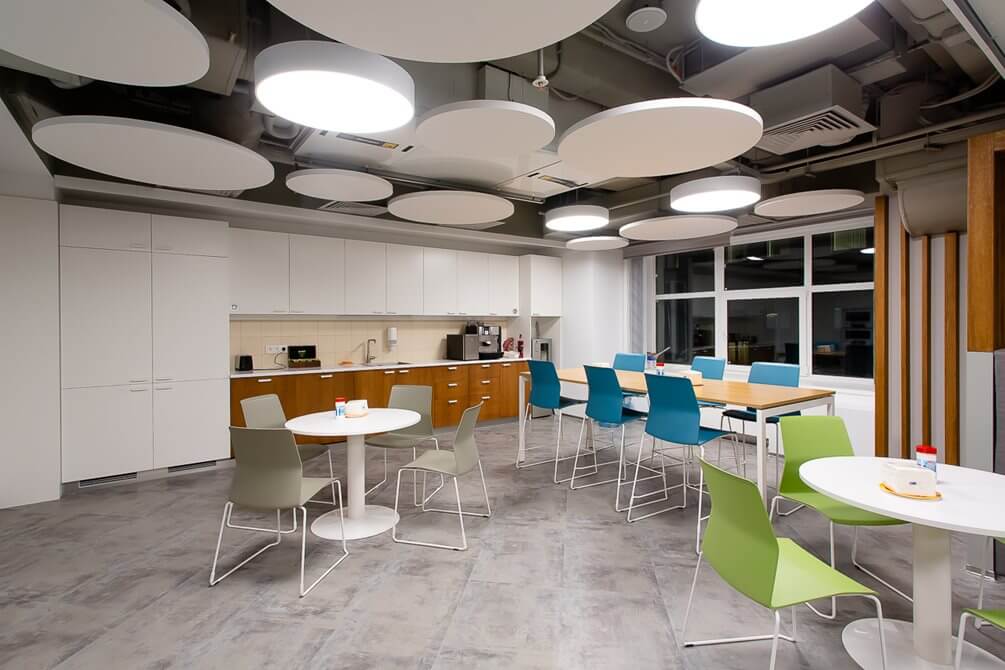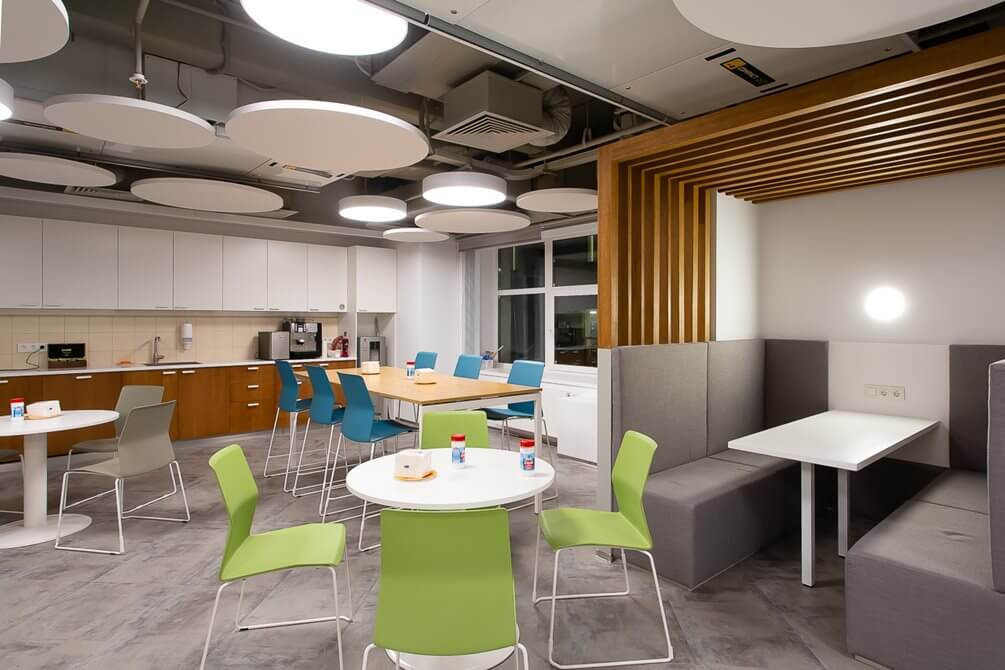 Для снижения шума в столовой были применены потолочные акустические панели SOUND OFF. Они созданы с заботой об экологии из переработанного материала.