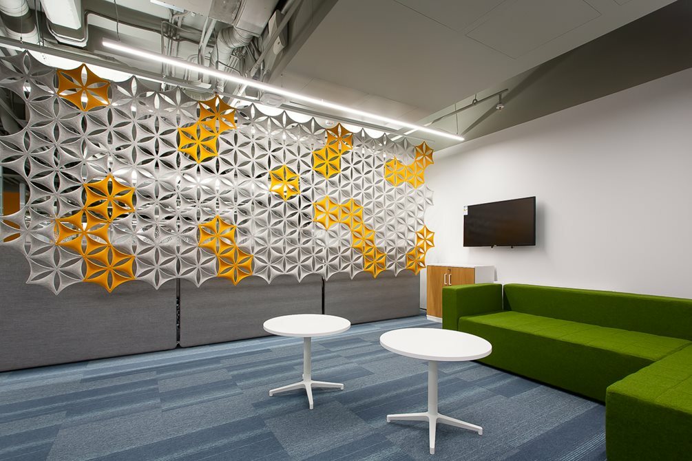 В офисе компании Dell было уделено особое внимание вопросам зонирования – для этого были использованы подвесные панели AirFlake, которые и выполнили функцию разделения площадей, и сыграли «декоративную» роль — задали пространству определенное настроение.