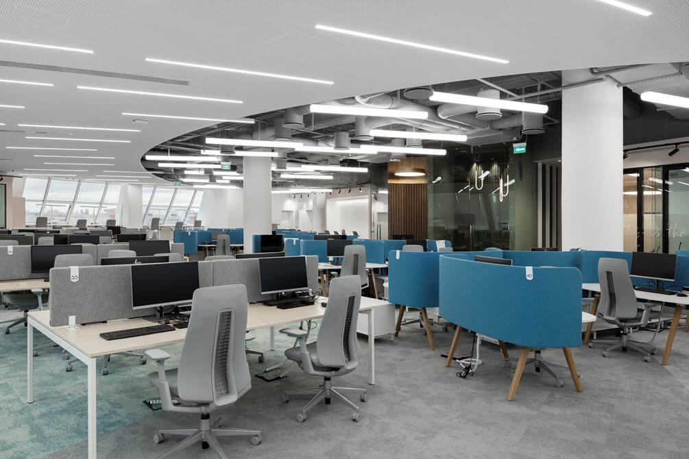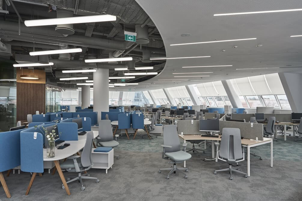 Офис реализован в стилистике Agile: в open space почти нет закрепленных рабочих мест, а количество сотрудников, которые здесь трудятся, по факту превосходит количество рабочих станций. Это сделано сознательно: учитывая, что большая часть персонала основное время проводит «в полях» - на выездных встречах, переговорах или в командировках – отсутствие закрепленных за ними мест позволяет гибко использовать пространство. Кроме того, даже у сотрудников, находящихся в офисе, есть возможность выбирать для работы ту рабочую зону, которая максимально соответствует конкретной задаче.