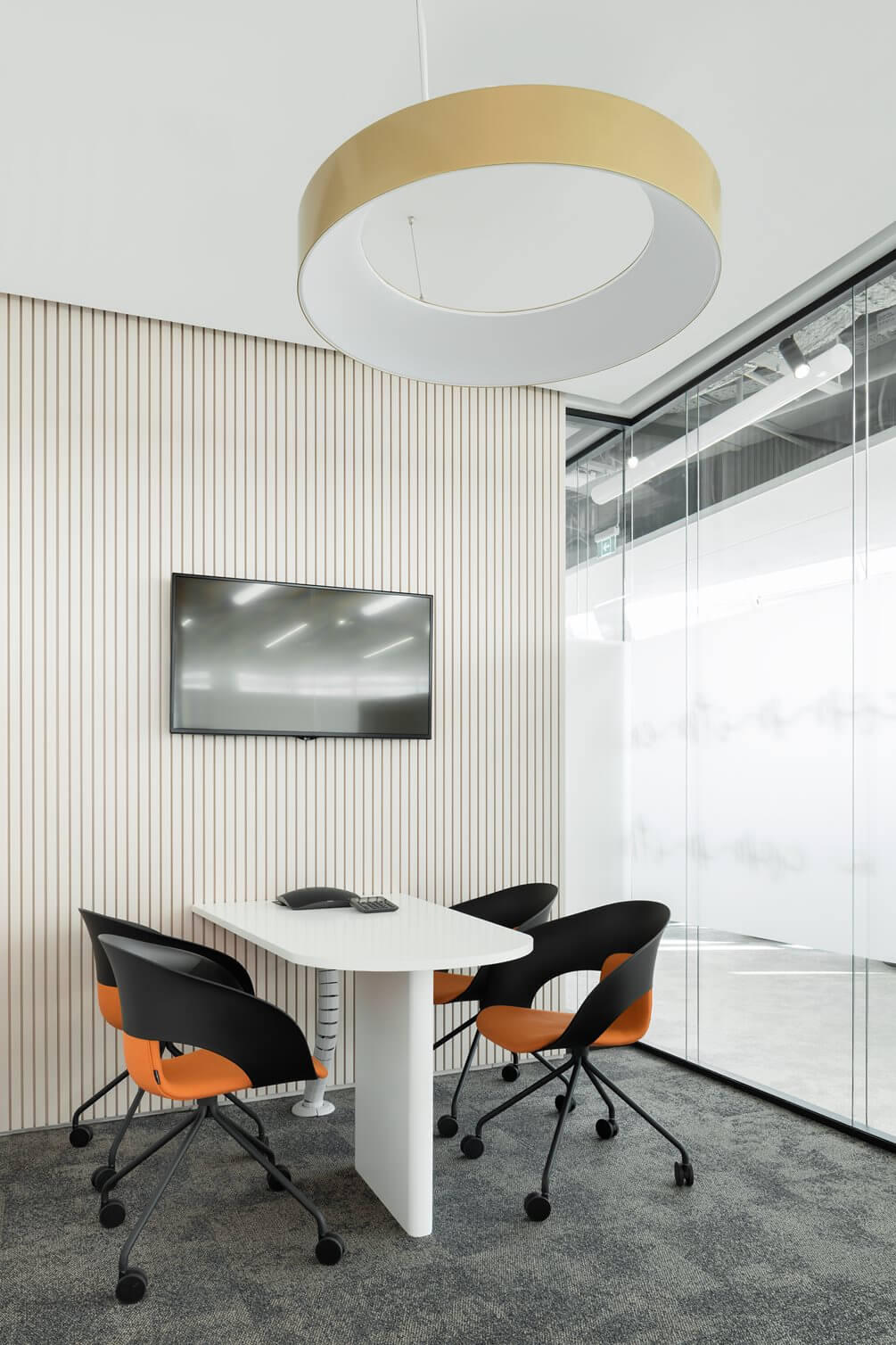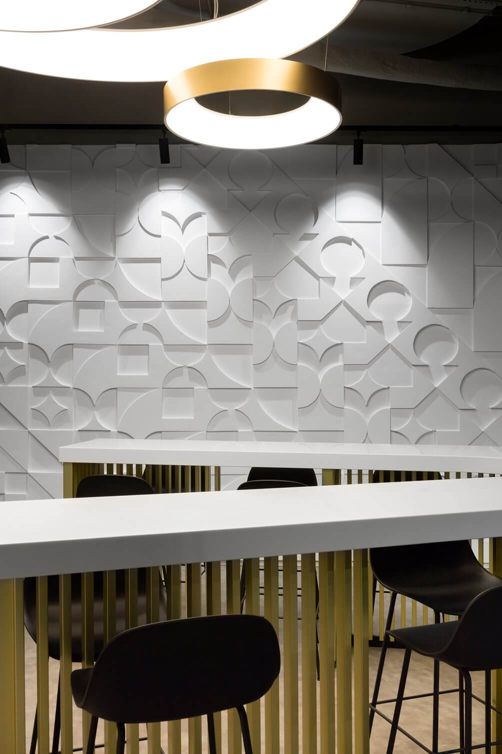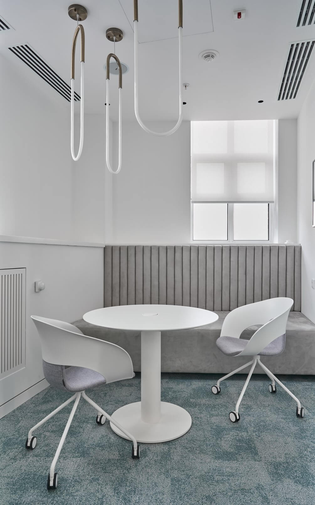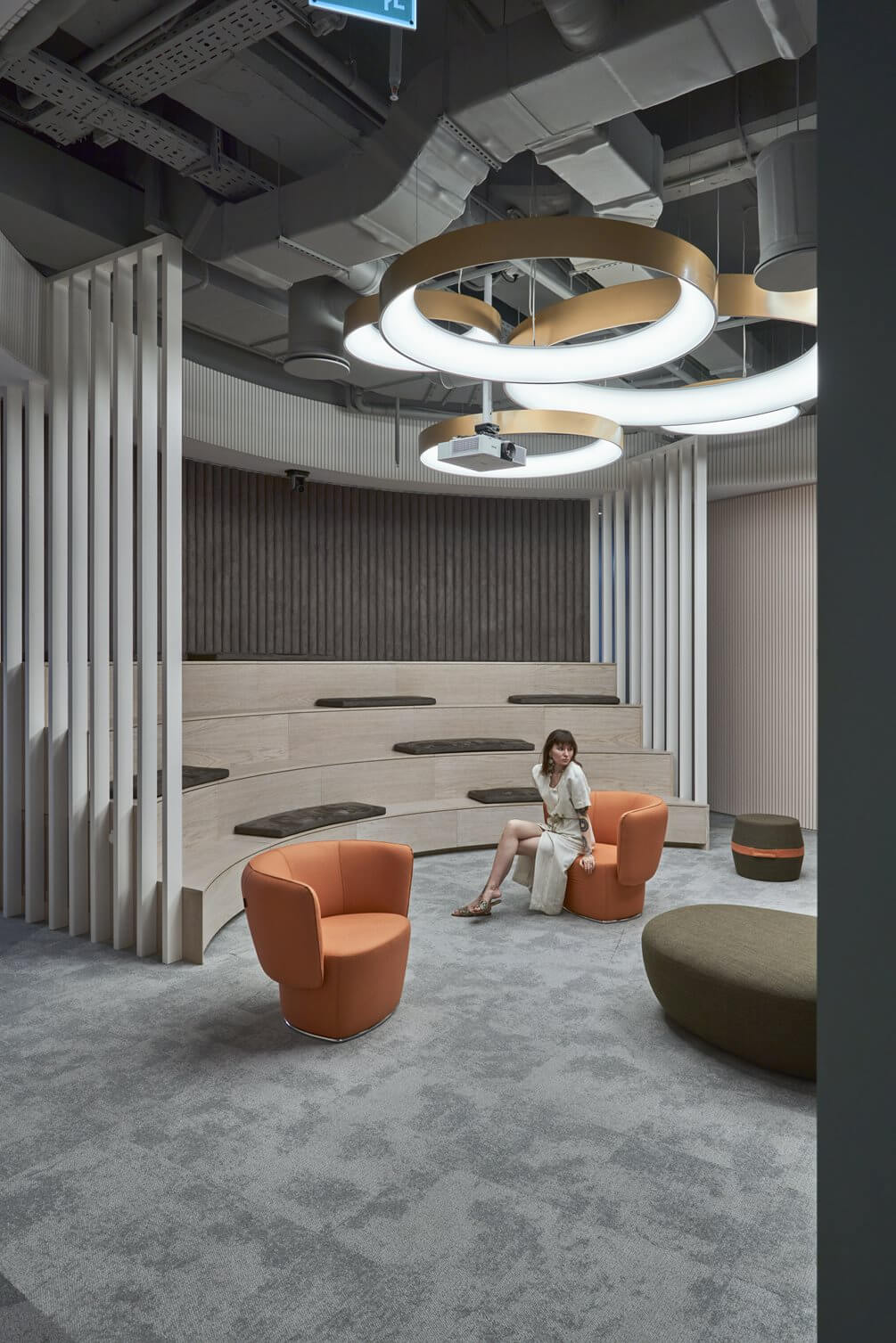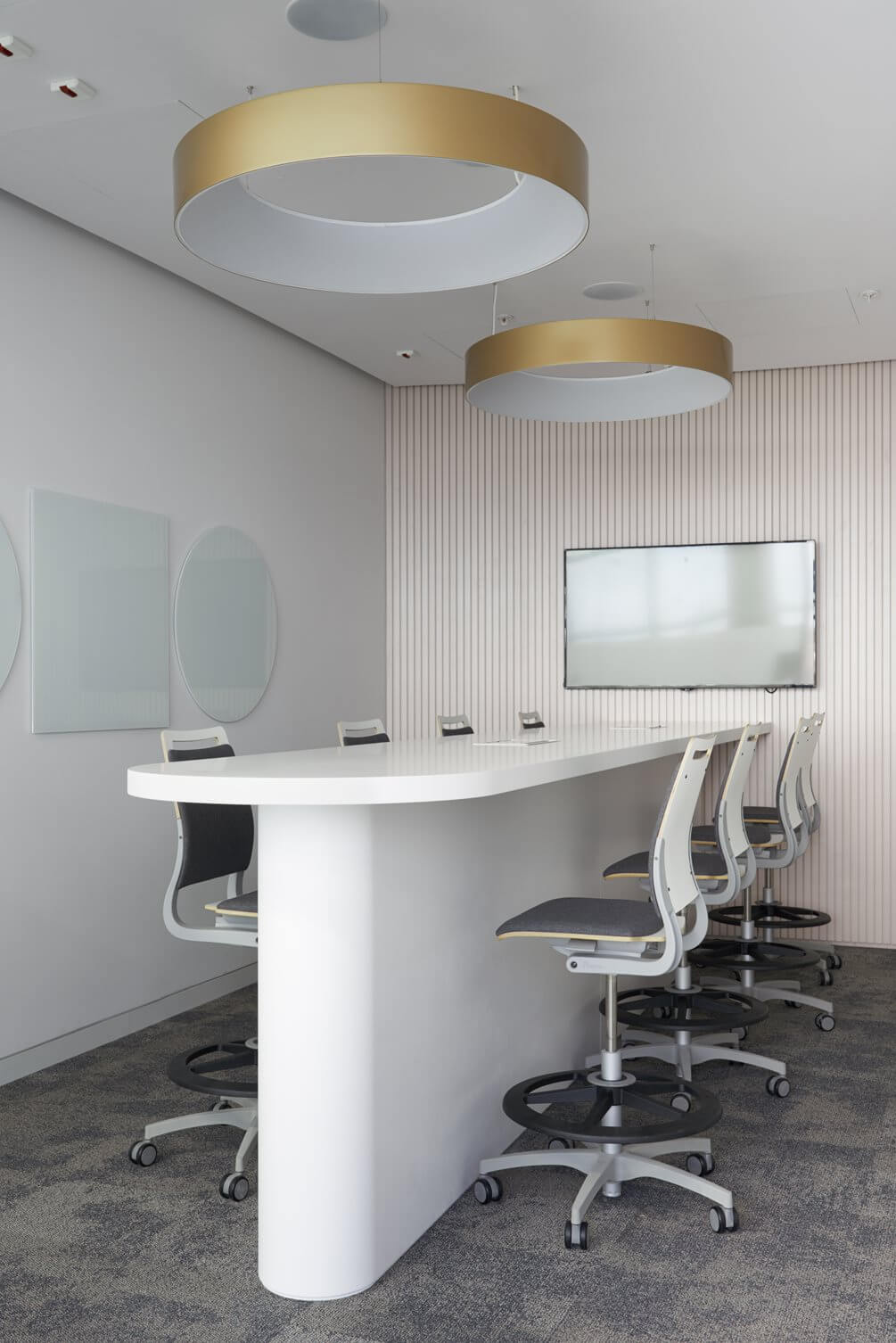 Интерьер реализован с применением большого количества нестандартных решений. Поверхности, материалы, ткани, декор – все это часто выходило за рамки стандартных производственных спецификаций и требовало спецзаказа. Например, стены в интерьере оформлены специальными акустическими панелями, выполненными по спецзаказу. Магнитно-маркерные доски круглой формы, как и овальные настольные экраны и столешницы рабочих столов, также пришлось производить специально под проект. Но в итоге интерьер получился стильным, изящным и необычным, с большим количеством интересных декоративных решений.