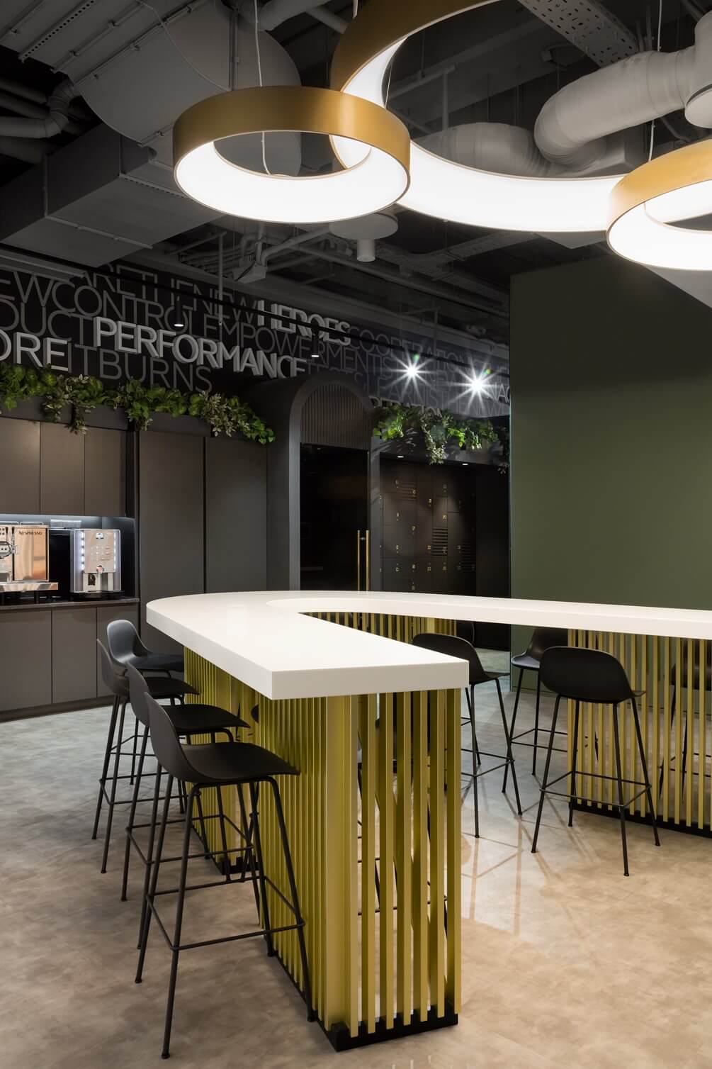Помимо open space, где, кстати, расположены и рабочие места для руководителей, здесь есть несколько больших и маленьких переговорных, зона кафе с высокими барными столами и стульями, пространство для неформального общения, атриум для проведения тренингов, лекций, корпоративных собраний и т.д.