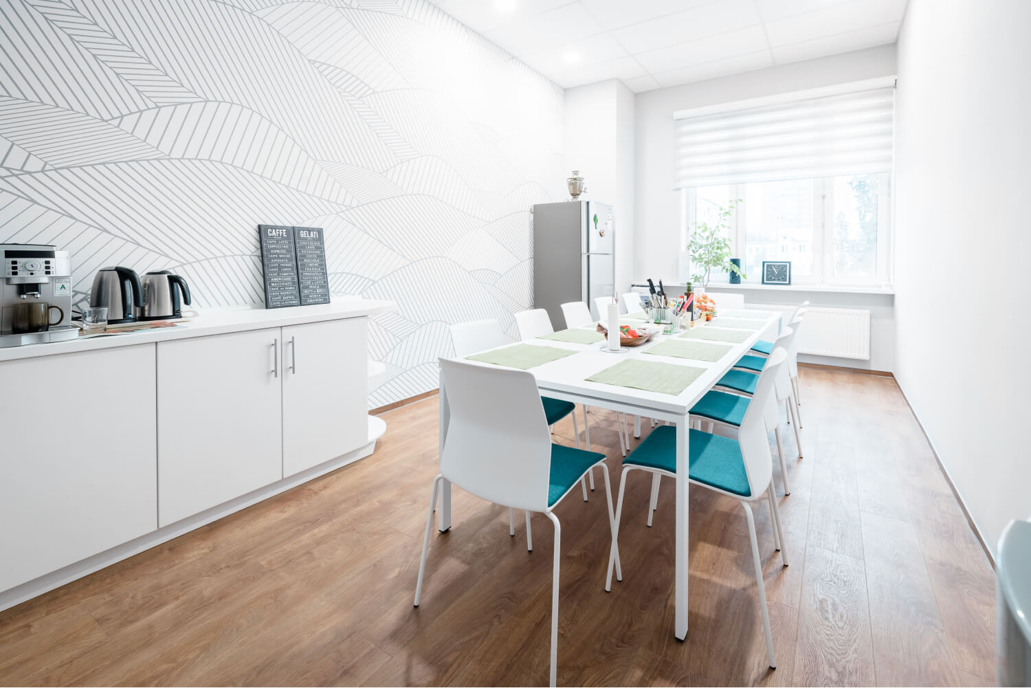 В офисе есть также небольшая кухня-столовая для сотрудников, где они могут поесть или передохнуть за чашечкой кофе. Белая мебель создает благоприятную атмосферу и визуально расширяет пространство.