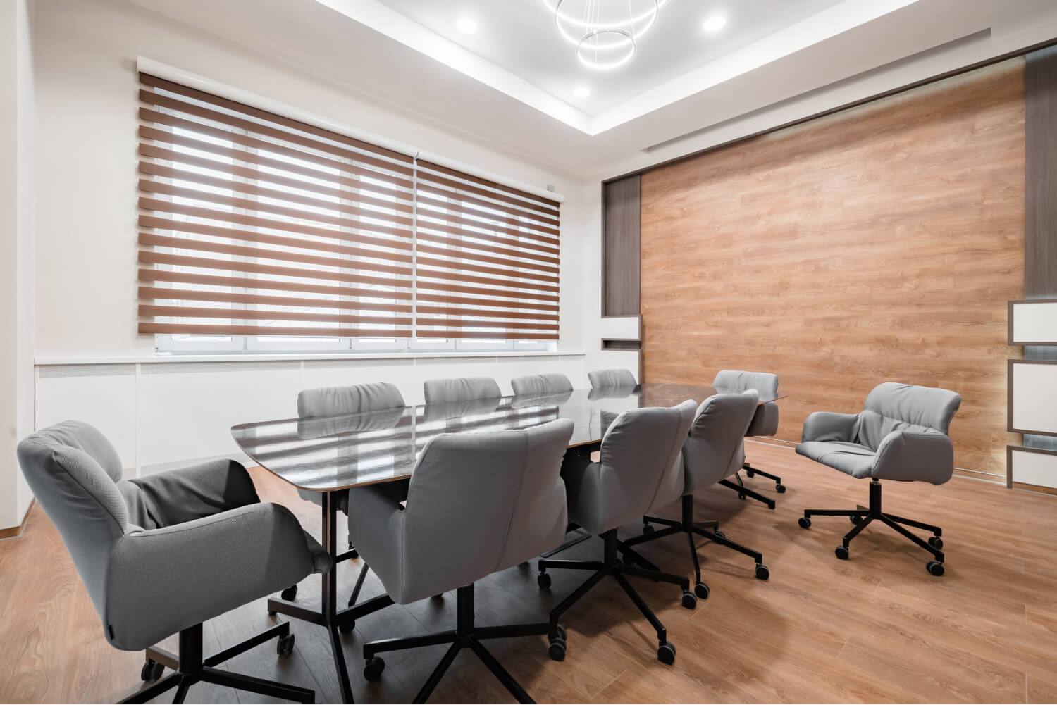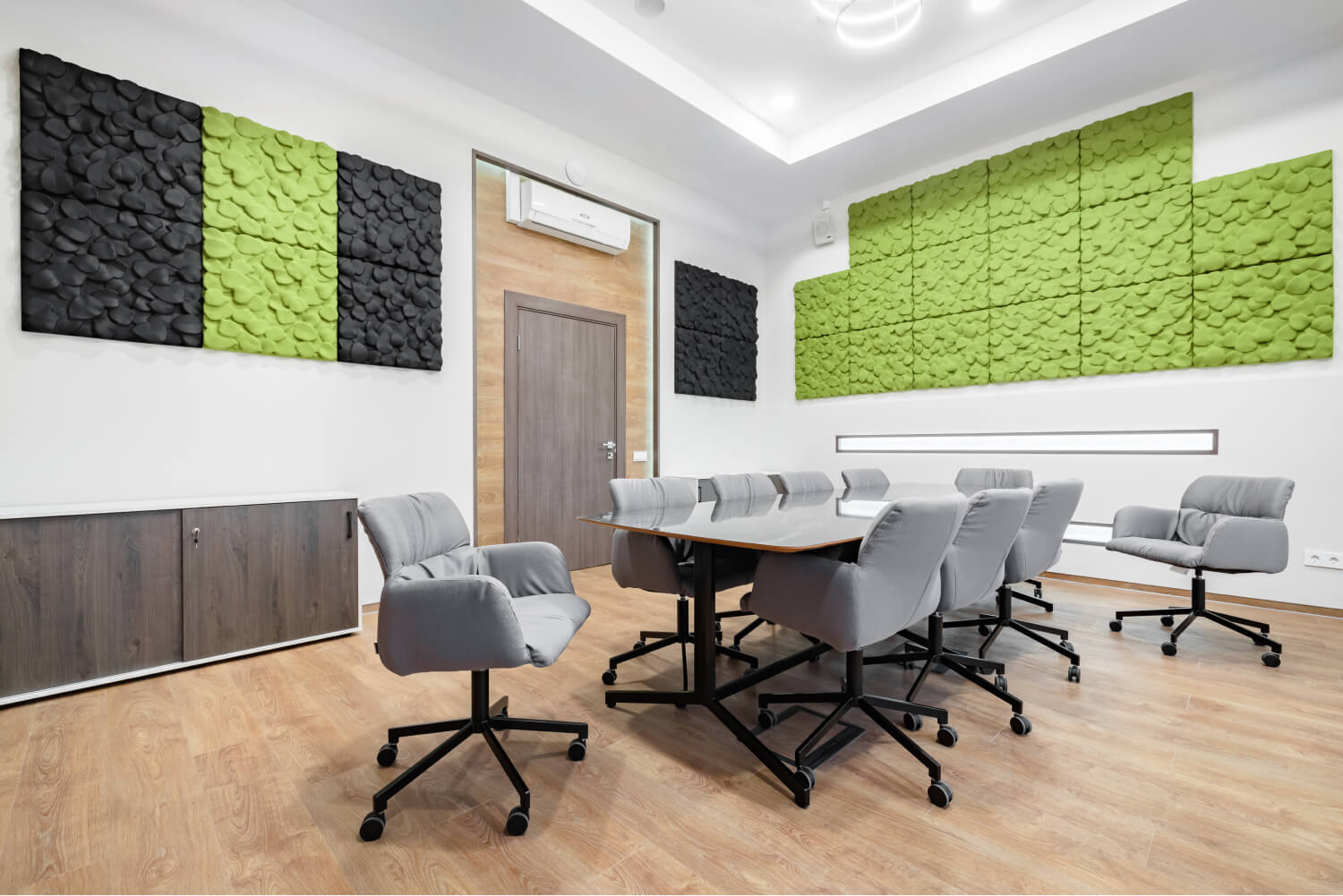 Строгий дизайн переговорной комнаты разбавляют яркие акустические панели Johanson design Leaves.