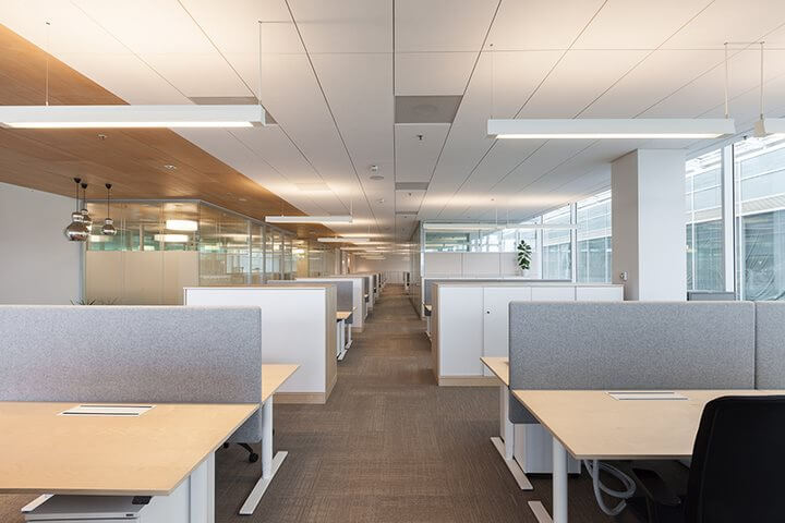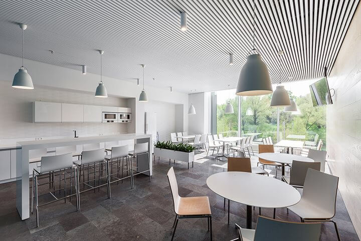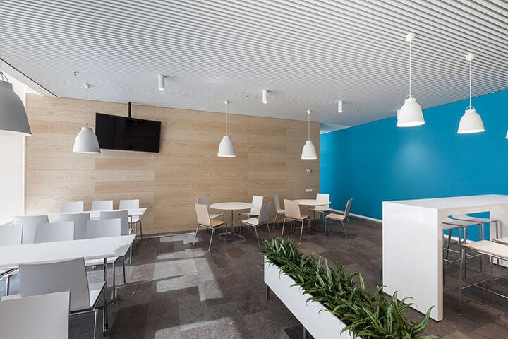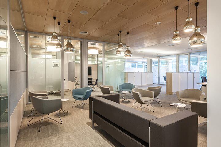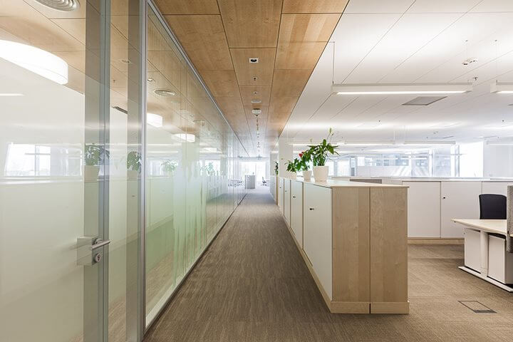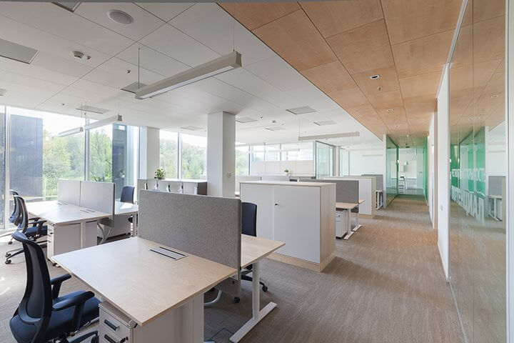 В интерьере отражена прозрачность, открытость и демократичность компании, ее уважение к сотрудникам. Все рабочие столы отделаны натуральным шпоном березы и оснащены разделительными акустическими экранами и механизмом подъема столешницы. Акустический комфорт поддерживают и перегородки с двойным остеклением и специальными акустическими глухими панелями из ткани и дерева.