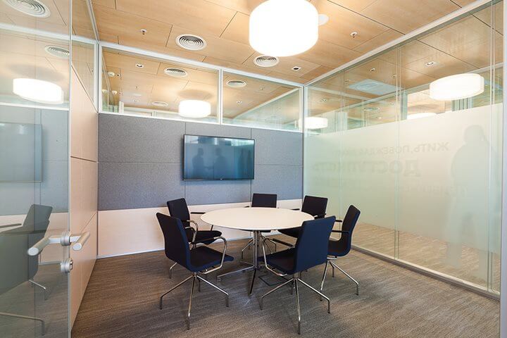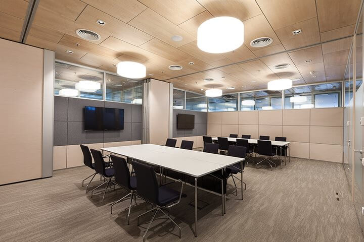 В офисе есть одна большая трансформируемая переговорная, которая может использоваться как большой конференц-зал или как три независимых помещения.