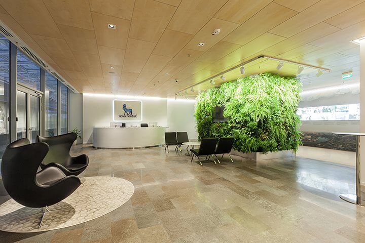 Как и все скандинавы, руководители Novo Nordisk - приверженцы здорового образа жизни, сторонники использования натуральных экологичных материалов, адепты минимализма при этом высокой функциональности охотно поддерживают скандинавских производителей, так что в проекте преимущественно использованы шведская и датская мебель и светильники, норвежский камень. Скандинавский стиль поддержан в интерьере белым цветом стен, минималистичной обстановкой, светлым деревом.