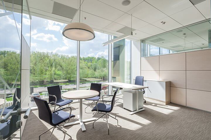 Основной сложностью проекта были сжатые сроки, рабочее проектирование велось в процессе строительства. Атриум, разделяющий этаж, на мой взгляд, мелкий недостаток потрясающего здания, которым является бизнес-центр «Крылатские холмы». Здесь совершенно уникальная для Москвы атмосфера. Из окон с одной стороны открывается вид на парк, с другой стороны – на пойму Москвы-реки. Рабочие места сотрудников находятся вблизи окон, то есть они могут наслаждаться этими видами – колоссальный плюс для офиса.