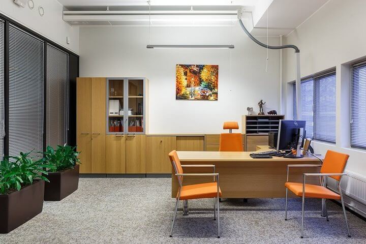 По правую сторону от рецепции расположены пять отдельных кабинетов с глухими боковыми перегородками из гипсокартона и полностью остекленной входной частью. Она обращена в сторону зоны отдыха и неформального общения, под которую выделили центральную часть офиса.