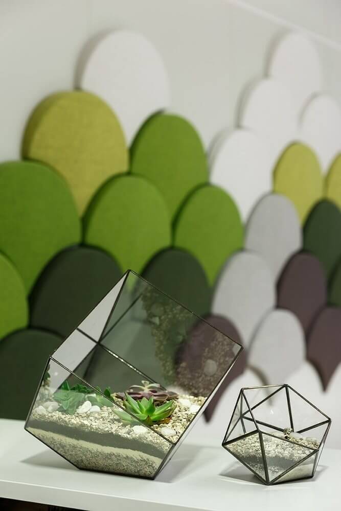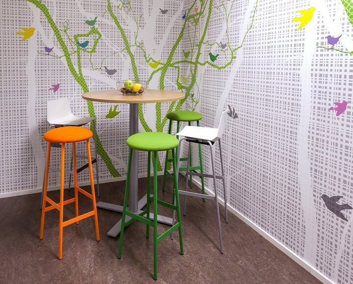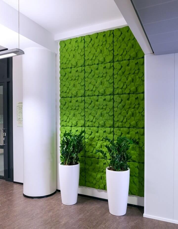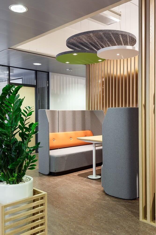 Ключевым моментом стали акустические решения. Для отделки пола в зоне открытого рабочего пространства использовали звукопоглощающий мармолеум Forbo. В open space между рабочими местами установили мягкие акустические экраны. В зоне приватного общения над диванами с акустическими спинками и бортиками висят акустические панели со встроенными светодиодами. Частично акустические решения применили и для стен. Из звукопоглощающего материала EcoSund в кабинете директора сделана и географическая карта, на которой отмечены филиалы компании, и яркая мозаика из круглых панелей, которые также выступают в роли декоративных элементов.