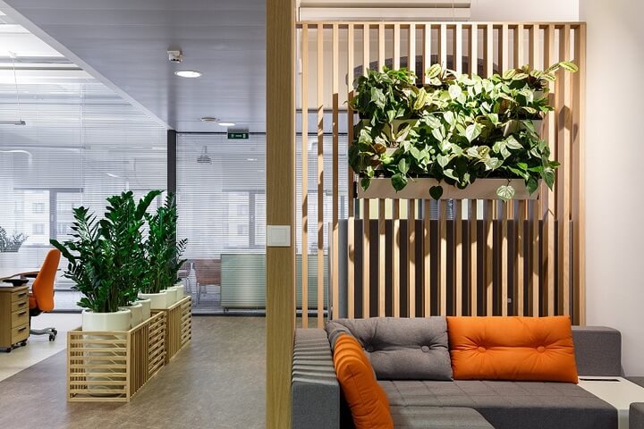 Границы намечены пунктиром: open space отделен только визуально напольными кашпо с фикусами, а территорию отдыха и общения выделяют символические перегородки из редких деревянных реек.