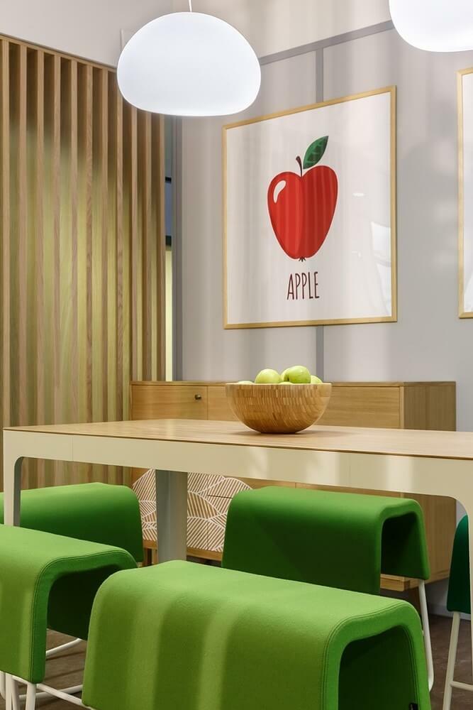 В ней разместили диваны с высокими акустическими бортиками, достаточно приватные, чтобы использоваться для переговоров или телефонных звонков, круглый стол, кофе-поинт с полубарными стульями, а также обустроили своего рода «столовую-гостиную» с большим диваном и пуфами, где можно не только перекусить, но и уютно устроиться, чтобы работать на ноутбуке или планшете.